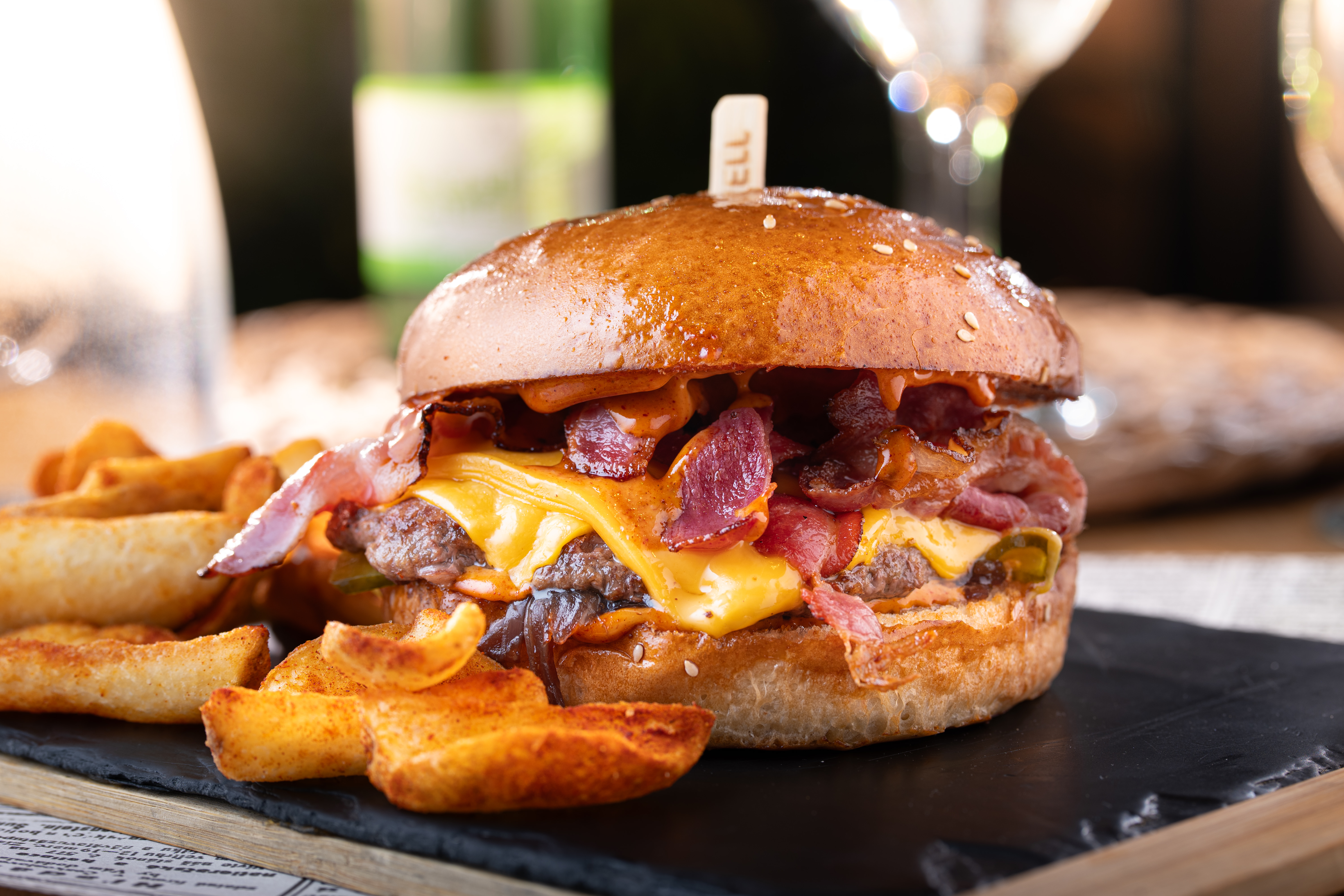 Zapekané kuracie prsia s hermelínom a Jamon Serrano šunkou (Pôvod mäsa: Slovensko) 7,9,12 podávané s korenenými americkými zemiakmi, maslovou omáčkou a malým listovým šalátom 150/200 g 9.20 €