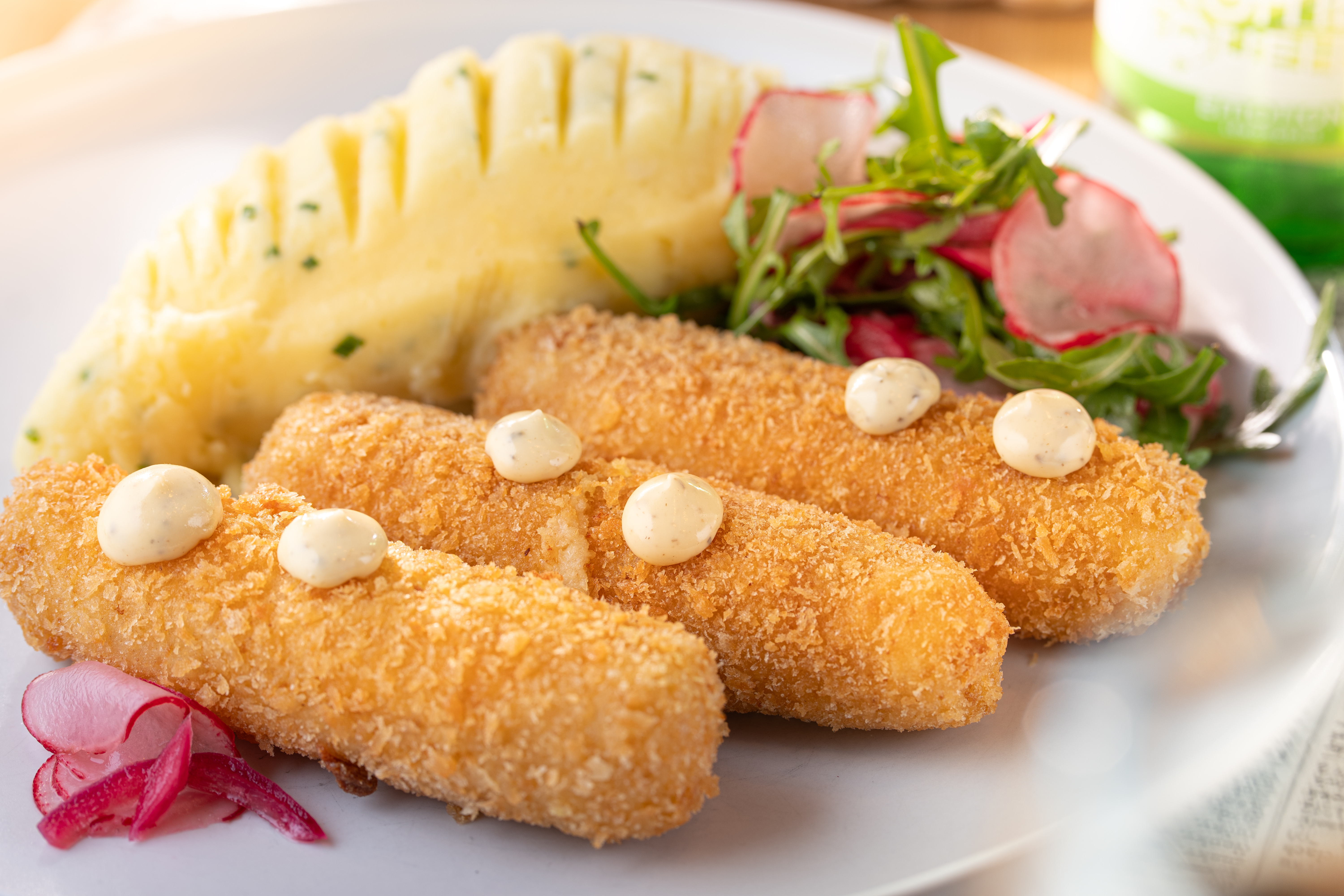 Vyprážaný syr gouda 1,3,7,12 podávaný so zemiakovými hranolkami, tatárskou omáčkou a listovým šalátom 130/180 g 9.20 €